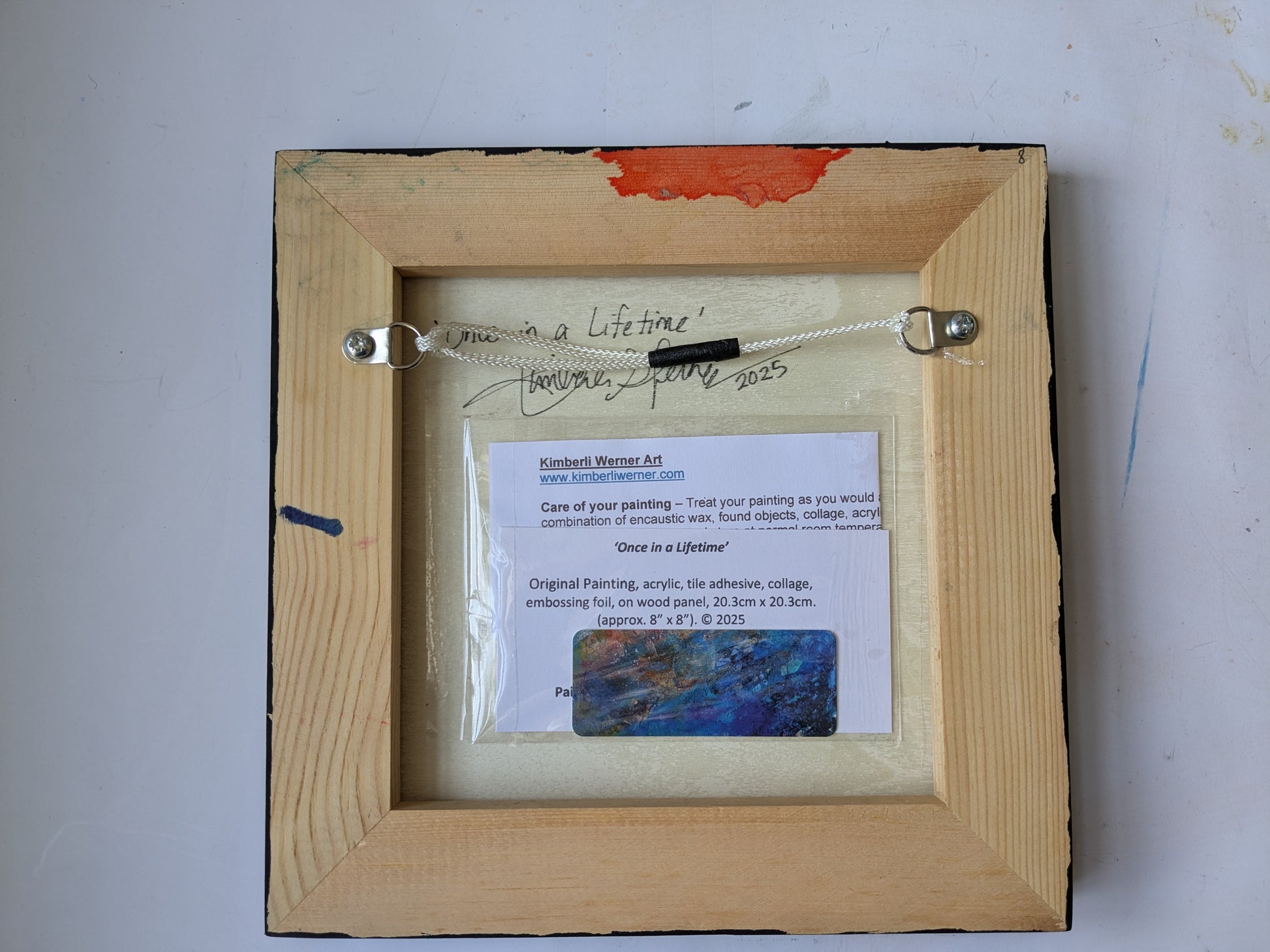 - Mixed media – acrylic, tile adhesive, collage, embossing foil, on wood panel.