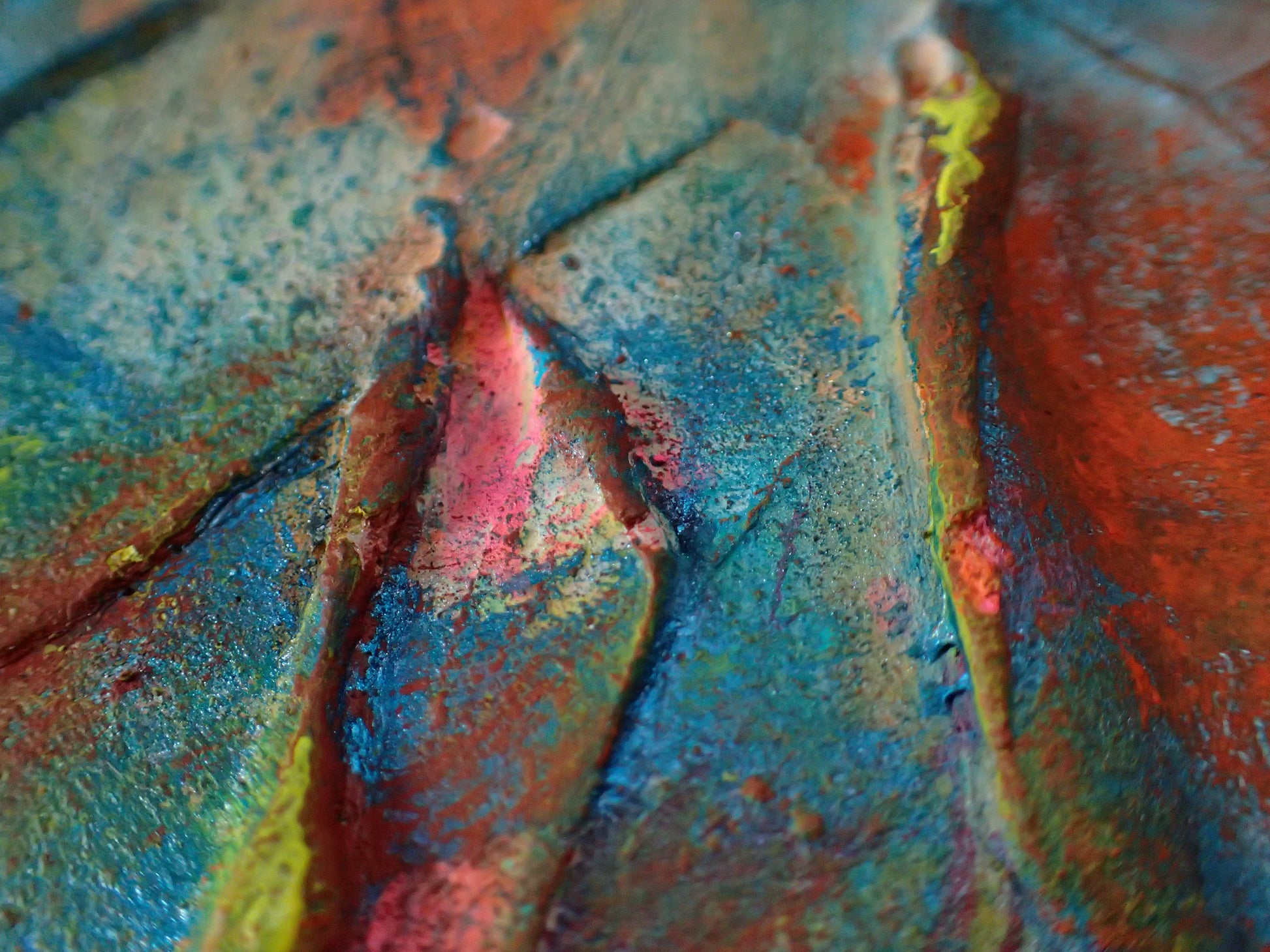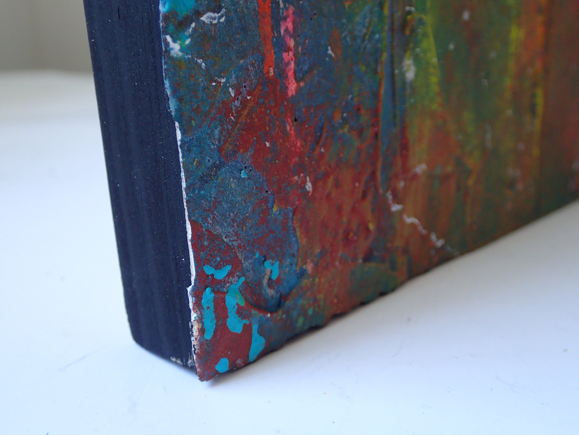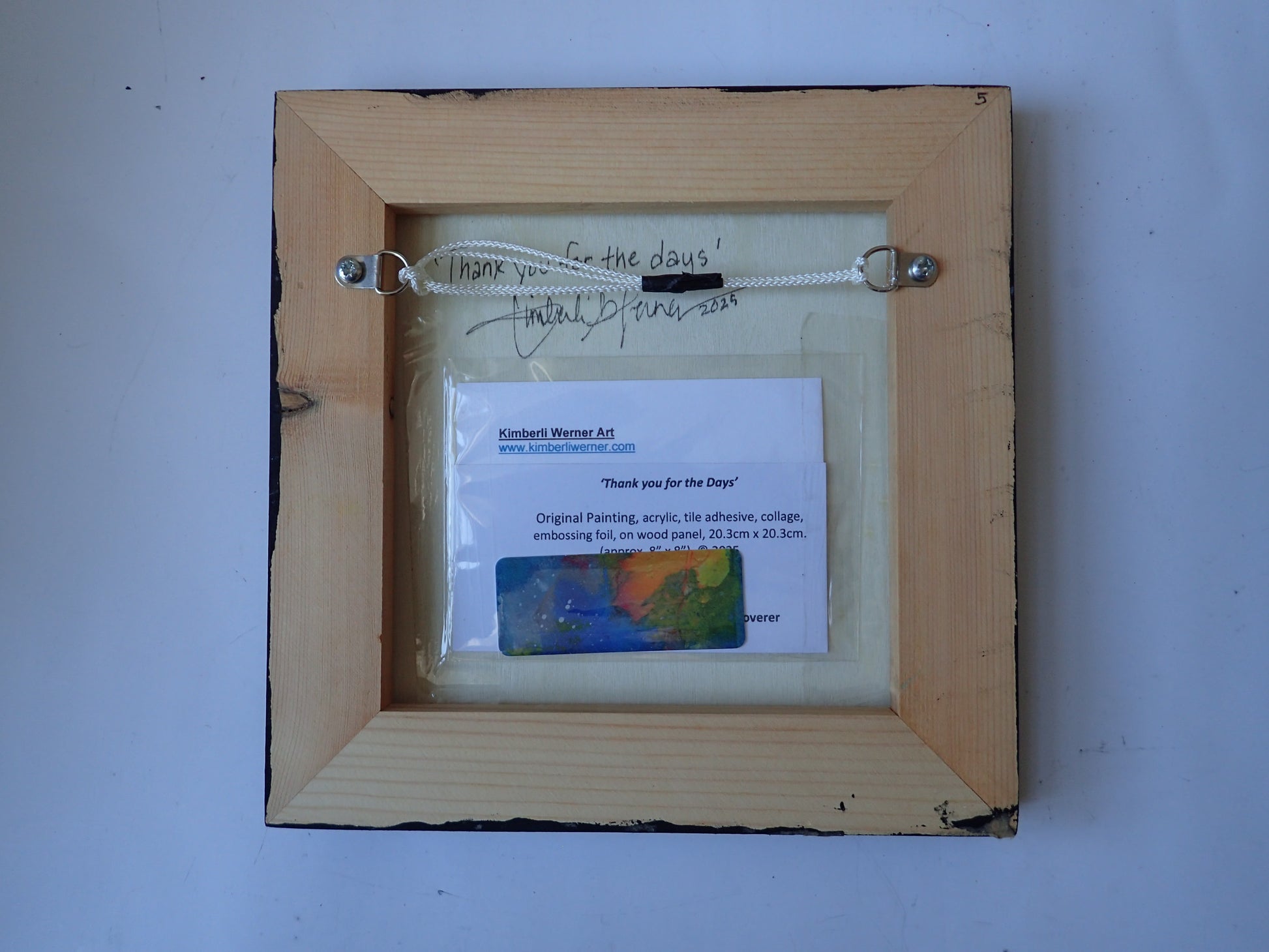 - Mixed media – acrylic, tile adhesive, collage, embossing foil, on wood panel.